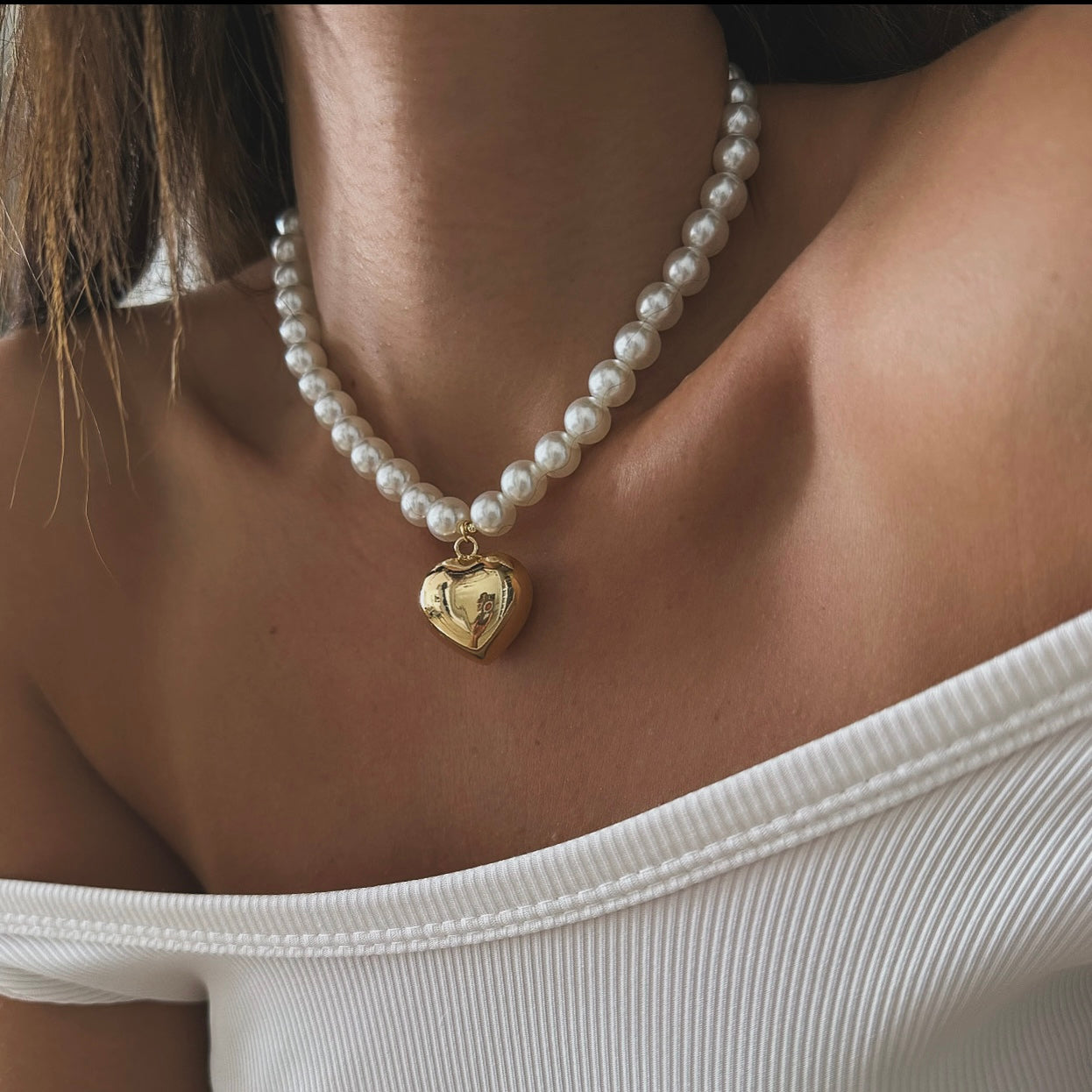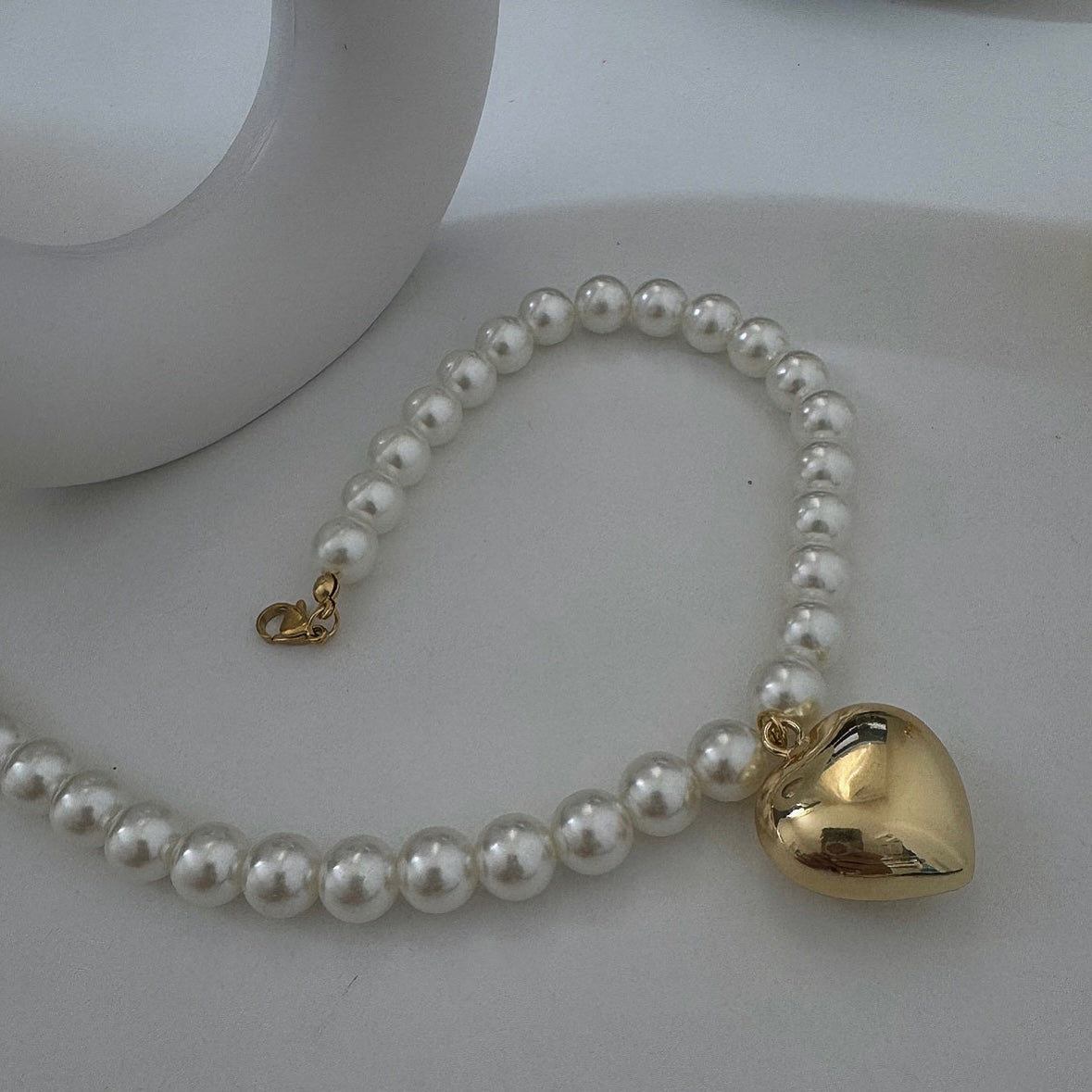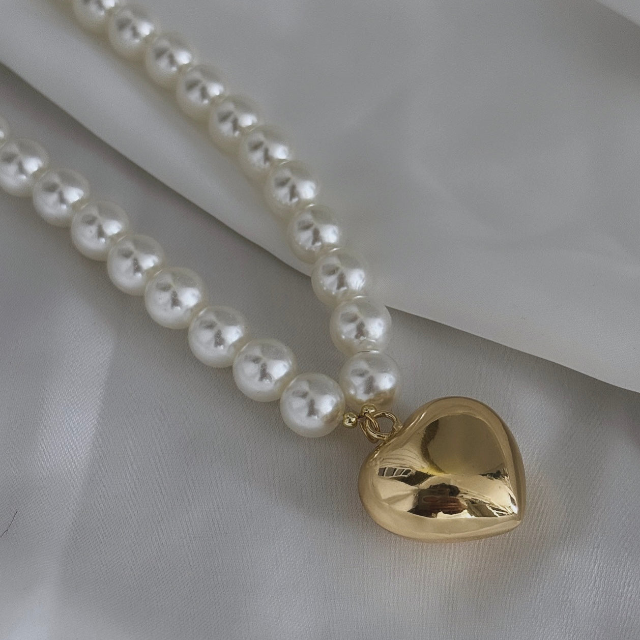 שרשרת פנינים עם נוכחות בשילוב תליון לב